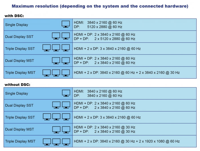 | Dual Display MST | HDMI + DP: 2 x 3840 x 2160 @ 60 Hz DP + DP: 2 x 3840 x 2160 @ 60 Hz |