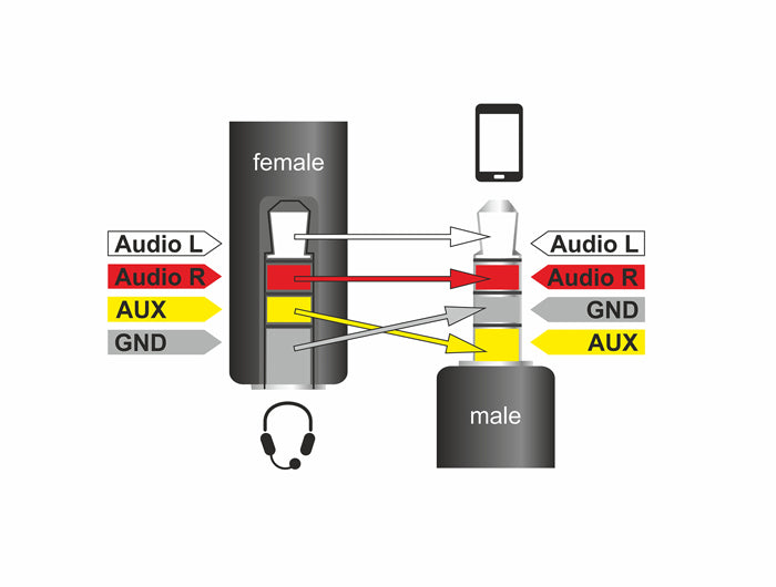Stereo jack female 3.5 mm 4 pin (Audio left – Audio right – AUX – GND)